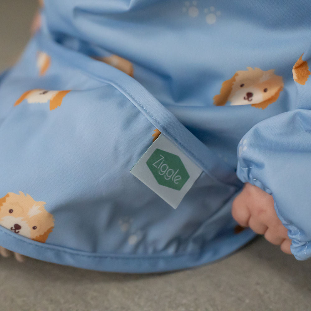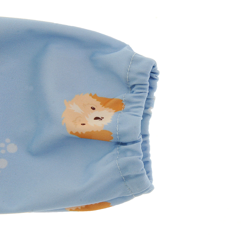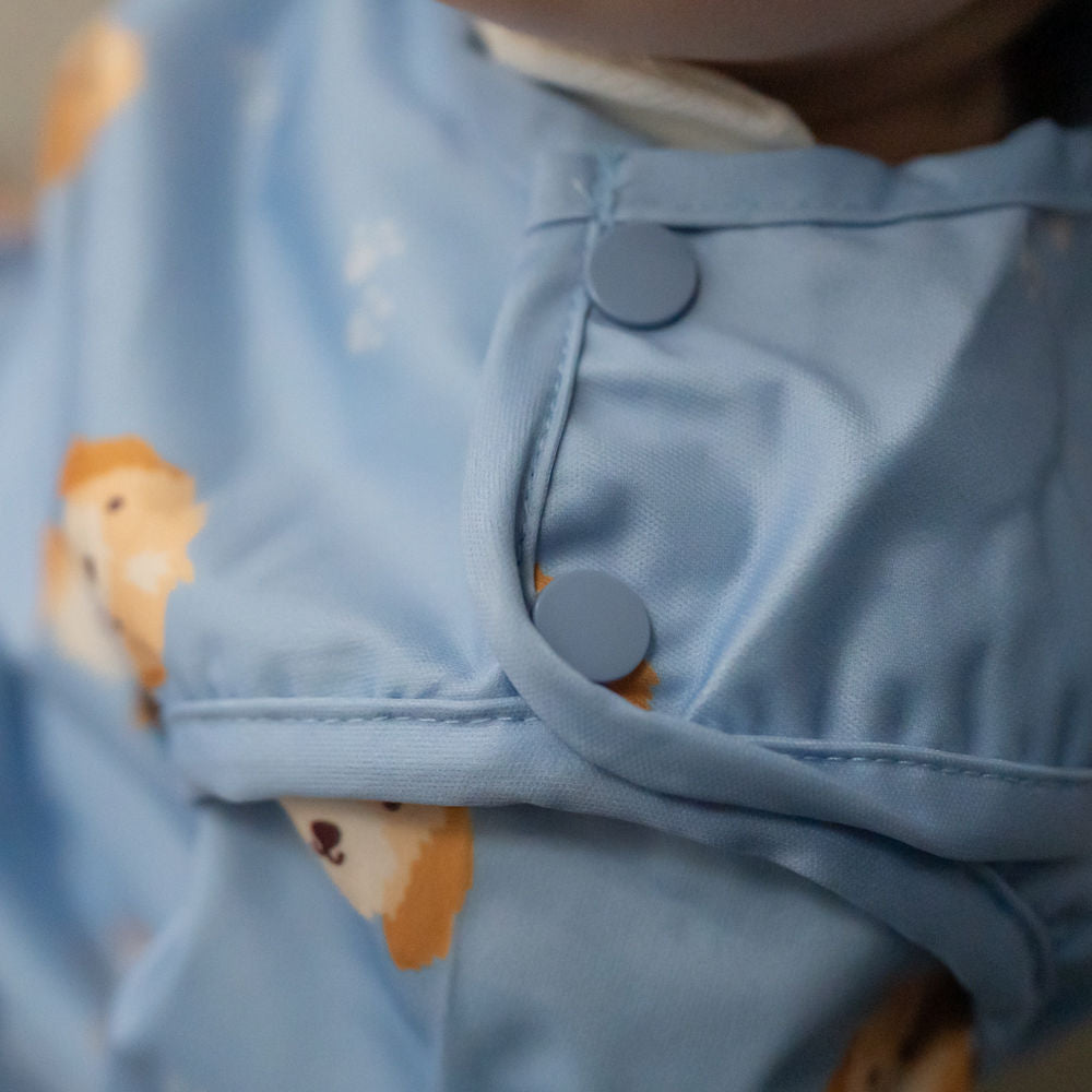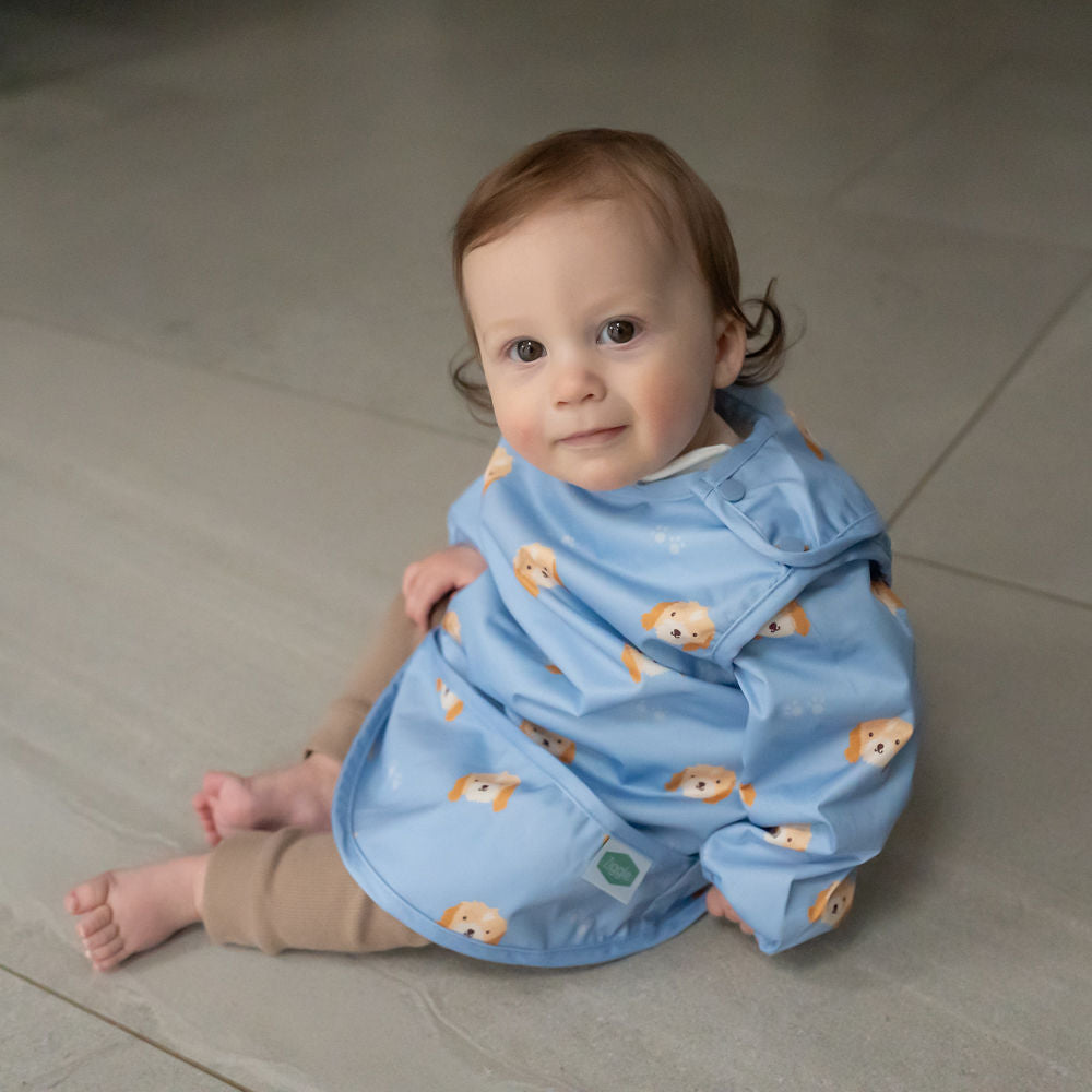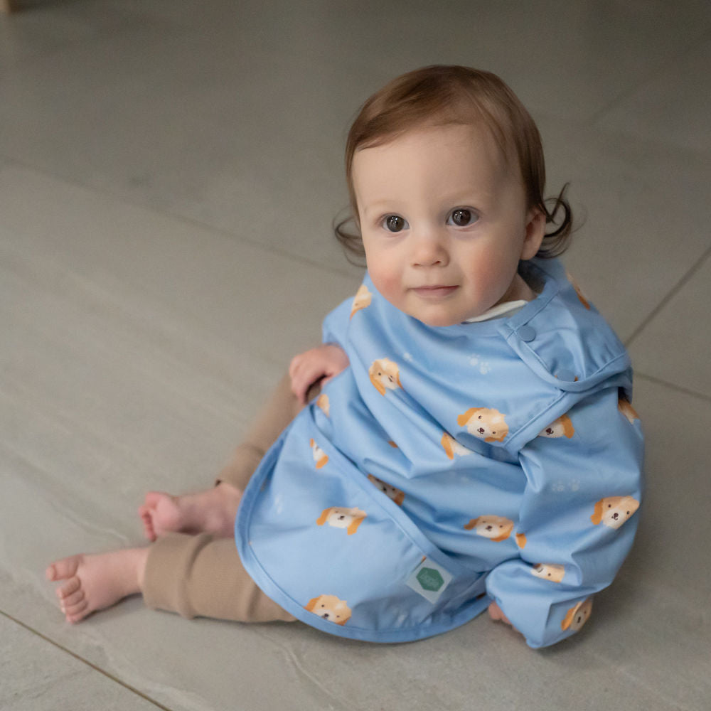- Covers front, back and arms and has elasticated cuffs to ensure baby stays clean and dry.